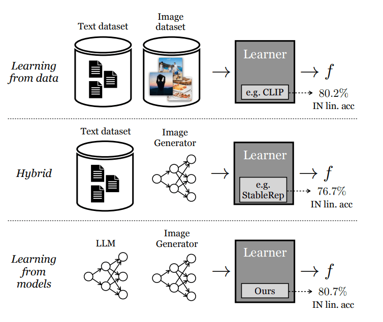 SynCLRは実データを使わずに合成画像と合成キャプションのみから視覚表現を学習する新しいアプローチです。CLIPは実データのテキストと画像を利用します。StableRepは実データとそこから生成された画像を使って学習します。SynCLRはすべてを合成(生成)データから学習します。論文を読むとStableRepが先行研究に相当するようですね。こちらも読んでおいたほうがよさそうです。
