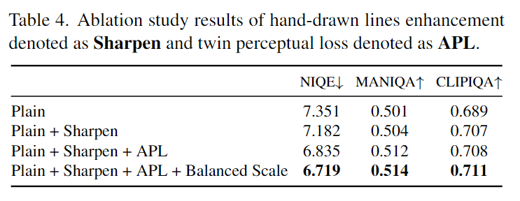 アブレーションスタディとして、手書き線の強調の有無による結果の違いを見ることができます。下の表のSharpenが手書き線を強調したものです。こちらの数値からも手書き線の強調が有効だったことがわかります。