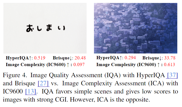 I-Frameを取り出した後に、複雑な画像だけを選び出してデータセットとして利用します。このために画像品質評価(IQA)を使うとよい結果が出ません。IQAをアニメ画像に使うと図4の左側をランキングの上位に持ってきてしまいます。提案手法では画像複雑度評価(ICA)を代わりに使います。図4の右側の画像はIQAは扱いが苦手ですが、ICAはうまく扱えます。