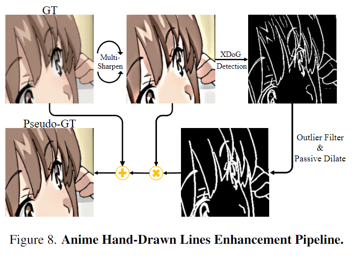 提案手法ではGTから手書き線を抽出して、それをGTと融合して疑似GTを形成しました。この疑似GTをSR学習に導入することで、シャープな手書き線を生成することができるようになりました。提案手法ではピクセル単位のガウシアンカーネルに基づくスケッチ抽出アルゴリズムのXDoGを利用して、先鋭化したGTからエッジマップを抽出します。詳細は省略しますが、さらに工夫がされているようです。