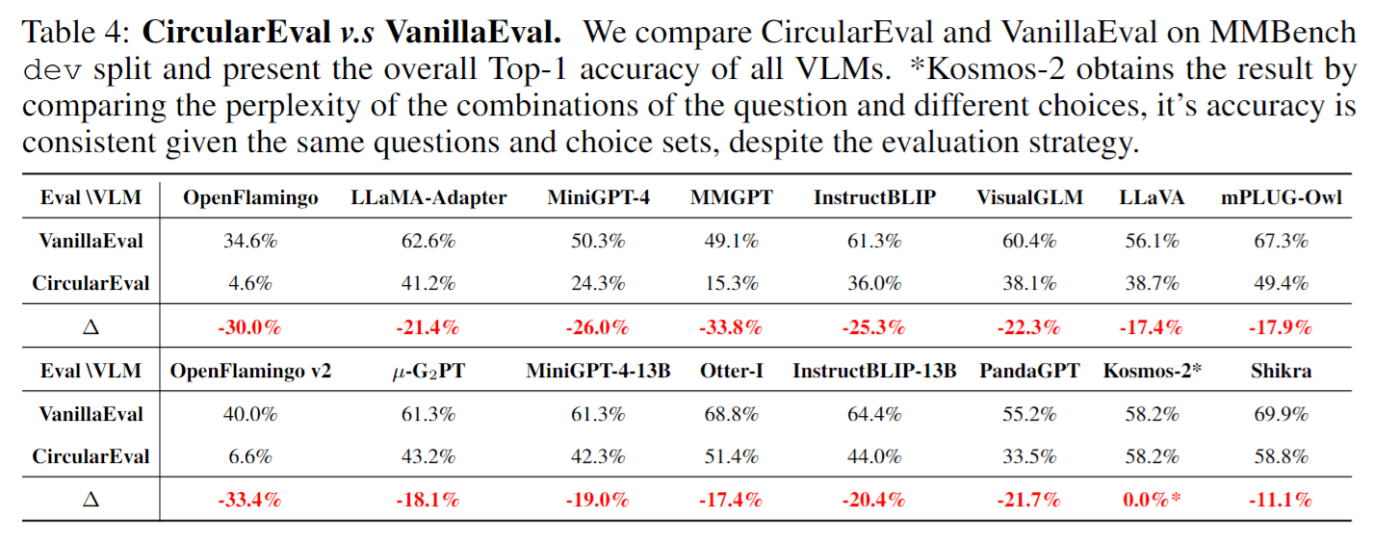 CircularEval(選択肢の数だけ推論)とVanillaEval(一回だけ推論)の比較を行いました。下の表がその結果です。こちらが示すように、ほとんどのVLMにおいて、CircularEvalへ切り替えると、モデルの精度は大幅に低下します。また2つの評価結果から異なる結論を得ることができます。例えば、InstructBLIPはVanillaEvalではLLaVAを上回りますが、CircularEvalでは逆の結論になります。