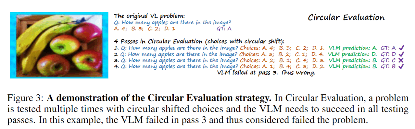 新しい評価戦略のCircularEvalが面白かったので、この部分を紹介します。VLMに4択問題を解かせる場合、ランダムな推論でも25%の精度を持たらし、VLM間の性能差を減少させる可能性があります。CircularEvalでは選択肢の数Nに対して、各問題はVLMへN回供給されます。このときに選択肢と答えに円形のシフトが毎回適用されます。