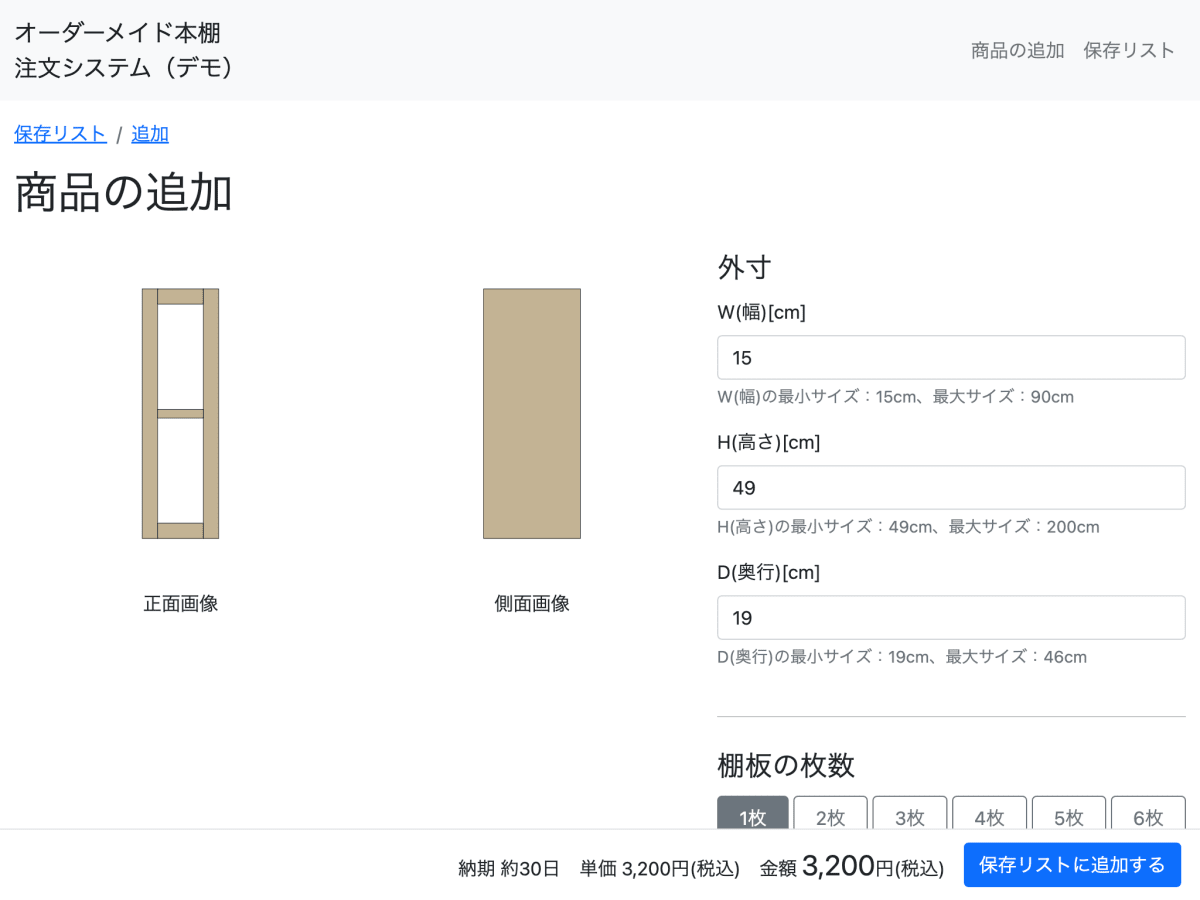 あまり良くできてなくて恥ずかしいのですがカスタムオーダーECの注文サイトのデモを作成しました。さすがに商品が収納ボックスだとクライアントに申し訳ない気がしたのでオーダーメイド本棚にしました。