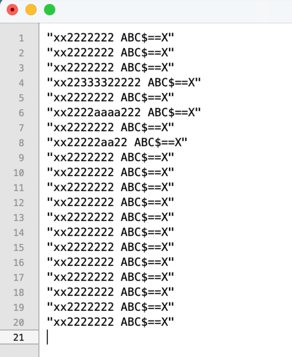 ABC$==Xという文字列が含まれていて - その後ろには、その行ごとにバラバラな文字列が続いている