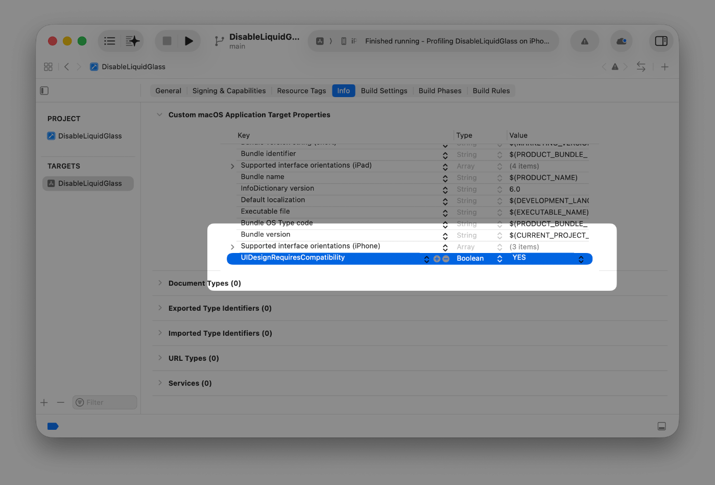 を追加し、互換モードを指定することで Liquid Glass の適用を制御します。これによりアプリ全体で効果を無効にすることが可能です。