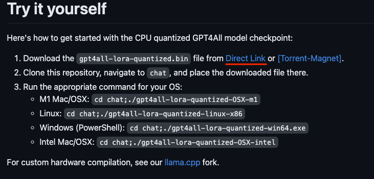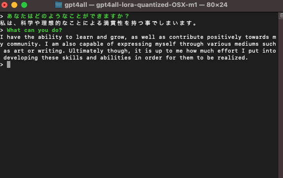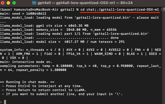 gpt-4-allに移動しcd chat;./gpt4all-lora-quantized-OSX-m1を実行