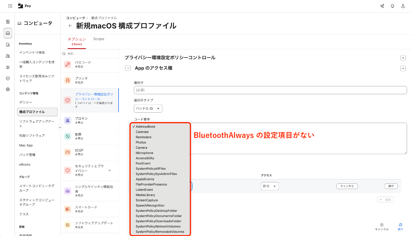 BluetoothAlways が通常選択できない項目のため、Jamf の画面で見ても何も設定が表示されません。何の設定を配布したのかが確認できないのは運用していく面では大きなマイナスです。
