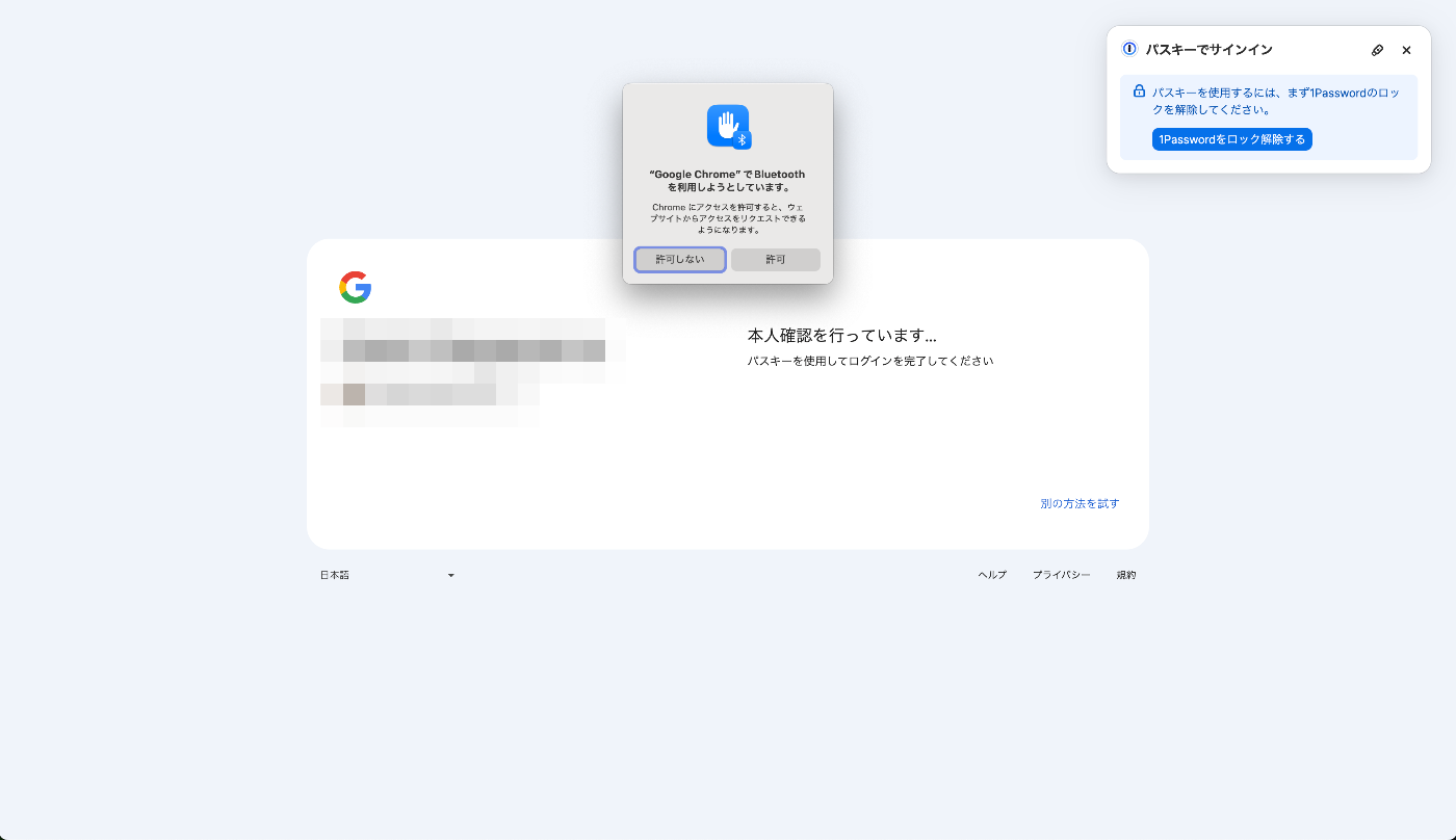 通常、Google Chrome に Bluetooth の許可を与えていない場合、パスキーでログインしようとすると以下のように Bluetooth の使用許可を求める TCC プロンプトが表示されます。
