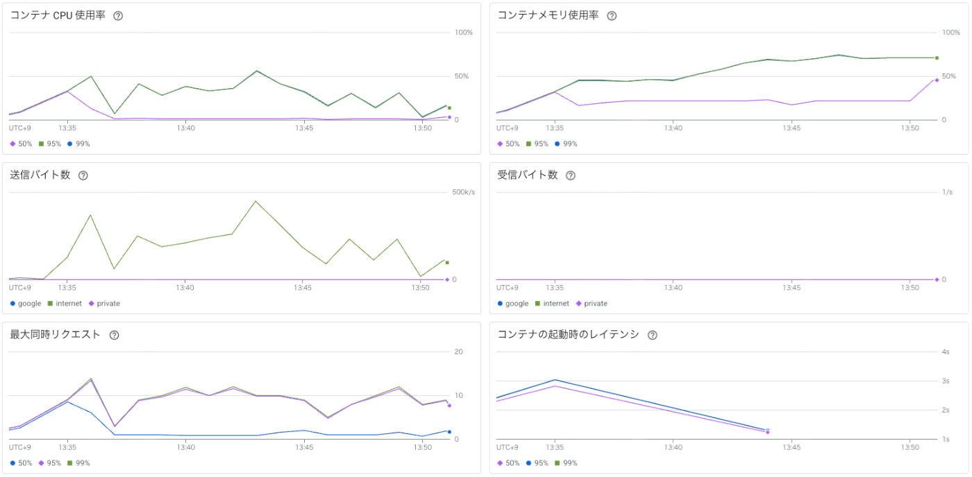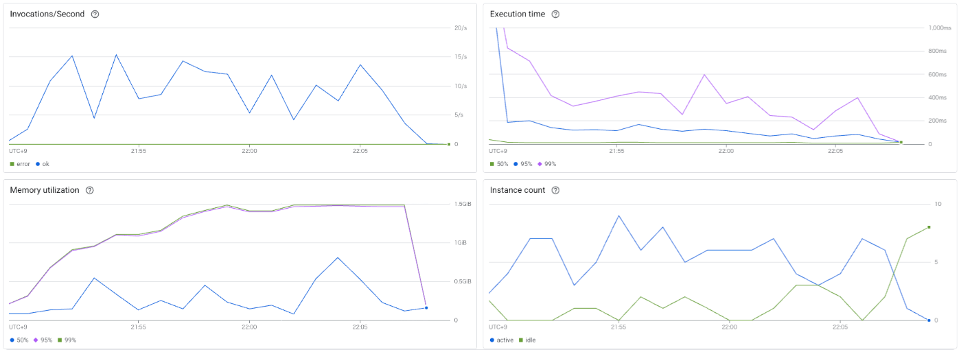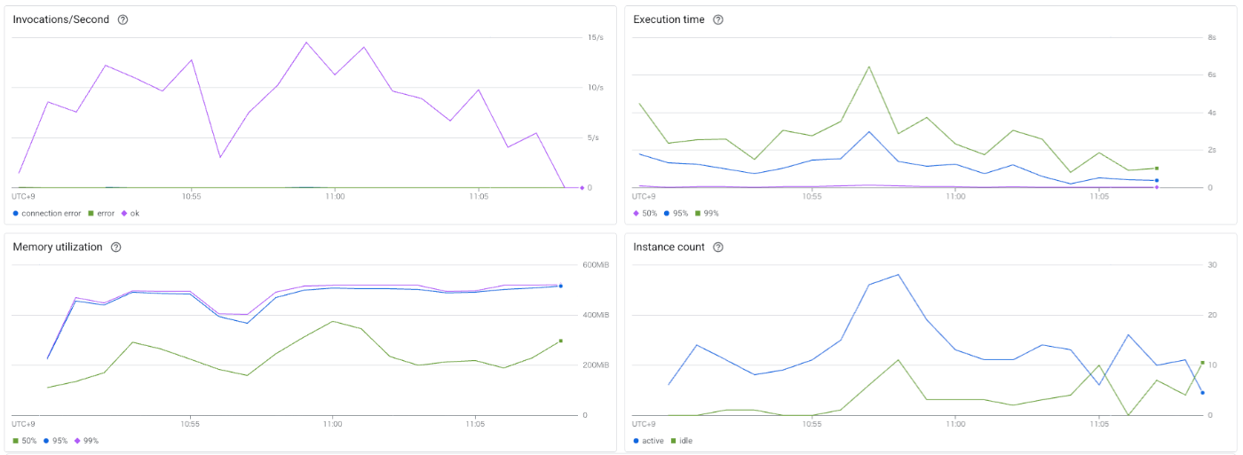 同時接続数は20で設定しています。(※第2世代はCloud Run環境なので取れるメトリクスも第一世代と異なります)