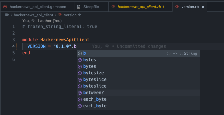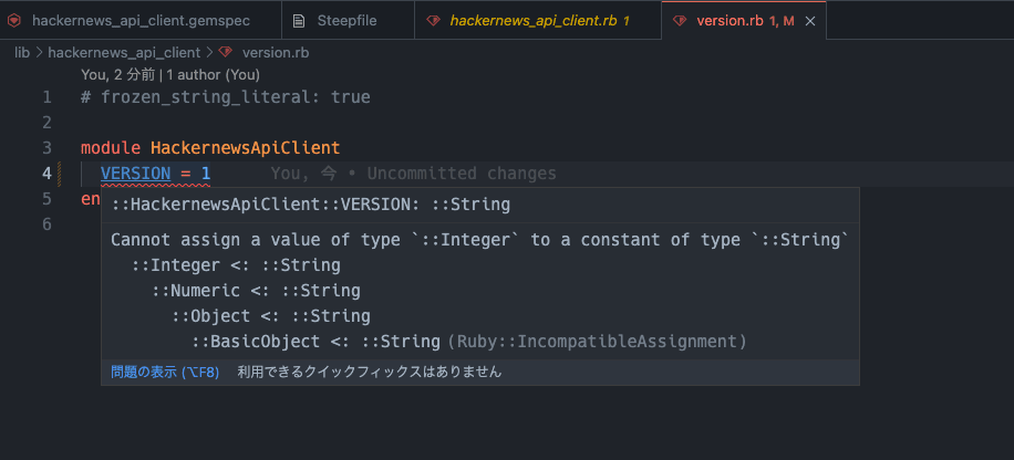 デフォルトで生成された rbs ファイルには HackernewsApiClient::VERSION の型が定義されています。これを Integer に変更してみます。