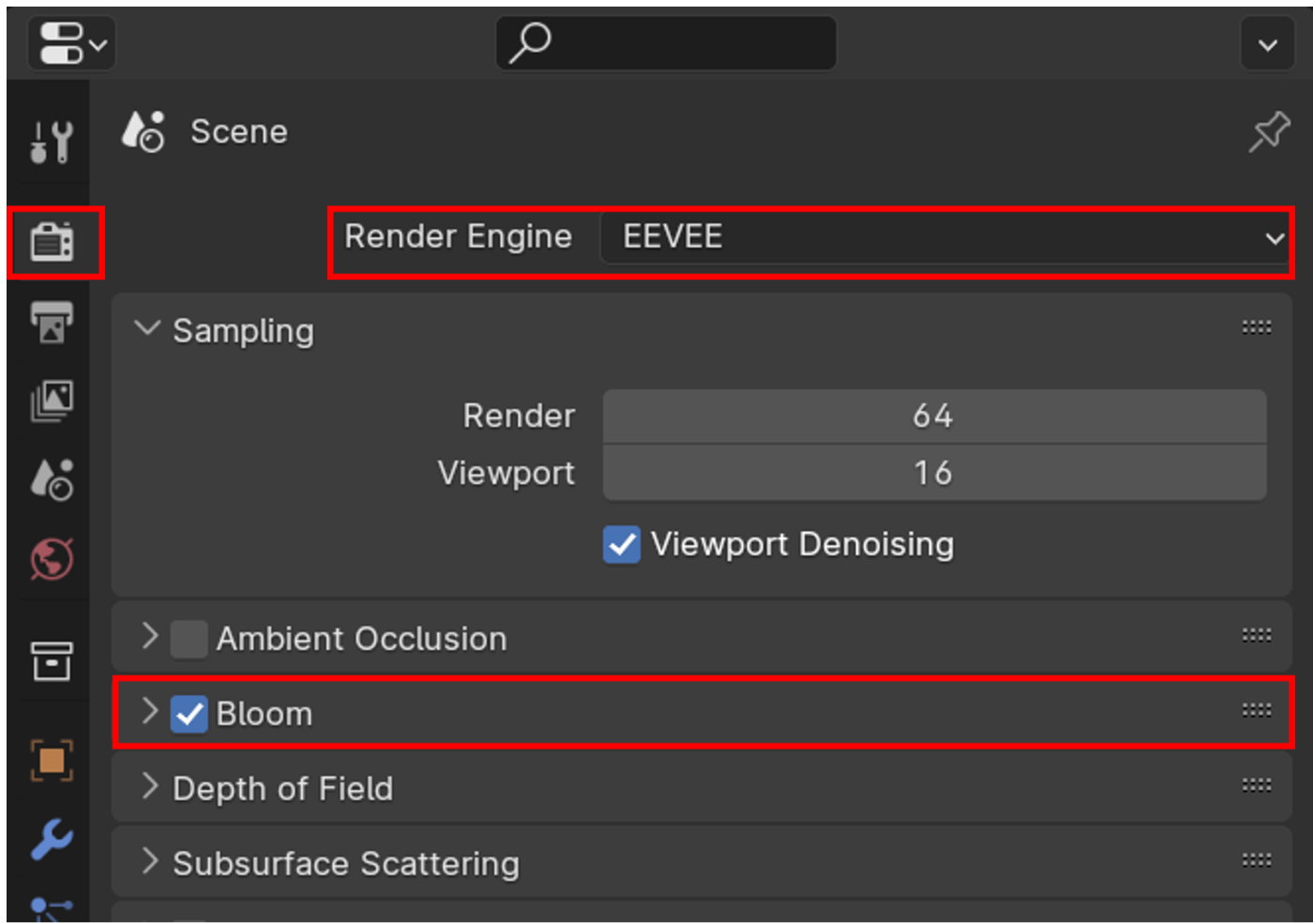 4.レンダープロパティで「Render Engine」が「EEVEE」になっている状態で「Bloom」にチェックを入れます