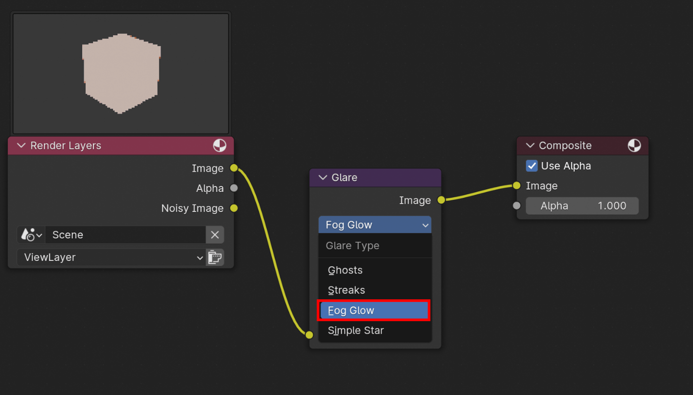 Shift + Aを押して「Filter」→「Glare」を選択して「Render Layers」と「Composite」の間につなげます