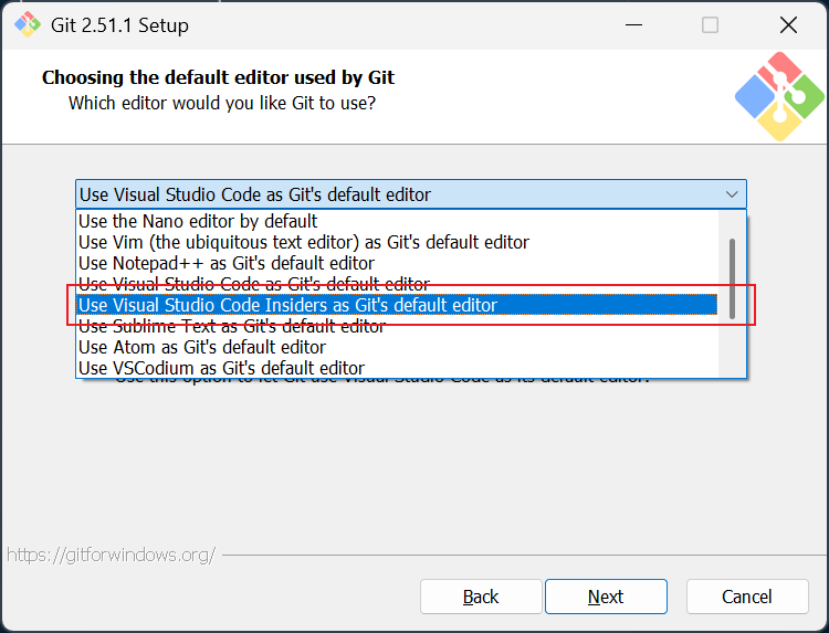 デフォルト設定で問題ありませんが、Choosing the default editorだけvscodeを選択してください。