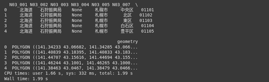 polars-stとgeopandasの大きな違いはgeometryの部分が前者はバイナリの一方、後者は緯度経度の座標情報になっている。その為、動作確認時には少々扱いづらい。
