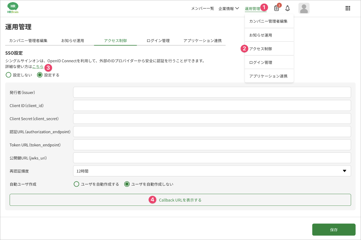 まずは HRBrain にログインし、人事評価メニューから 運用管理 → アクセス制御 の順に開き、SSO 設定 を 設定する