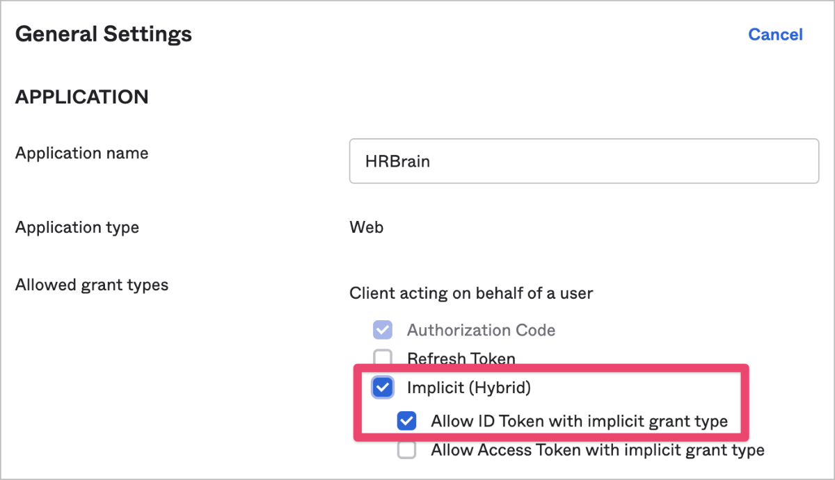 ここは任意ですが、もし HRBrain 起点の SSO(RP Initiated Sign-On) だけではなく Okta 側からの SSO(IdP Initiated Sign-On) も実装したい場合は General Settings セクションの Allow grant types で Implicit (Hybrid)