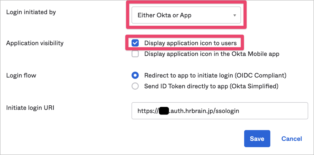 にチェックを入れ、その下の LOGIN セクションの Login initiated by の値を Either Okta or App