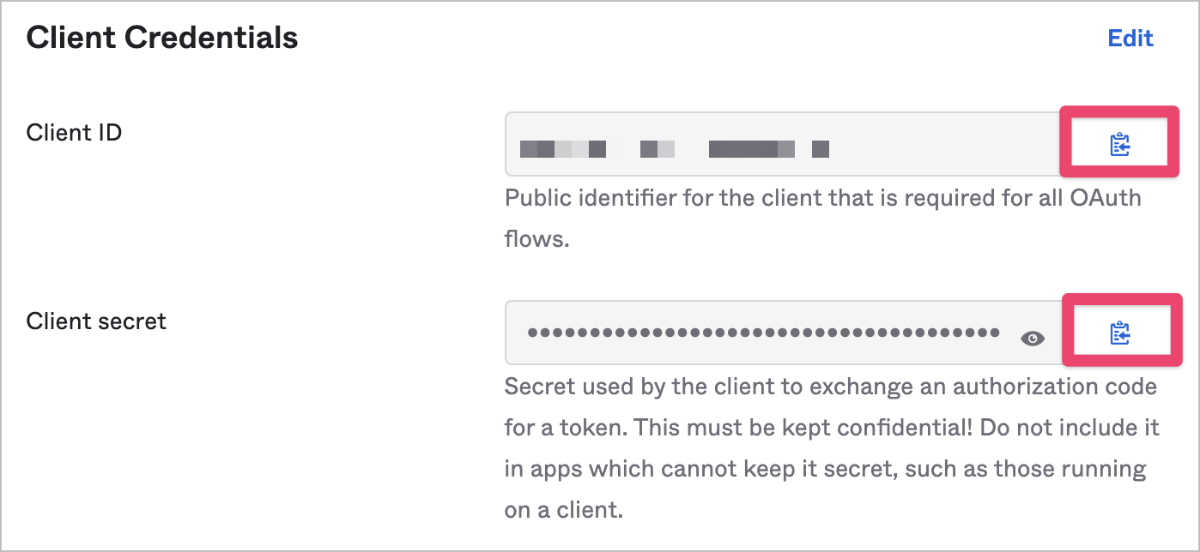 続いてその下にある Client Credentials セクションの Client ID と Client secret をコピーし、HRBrain の SSO 設定画面で同名の設定項目にペーストします。