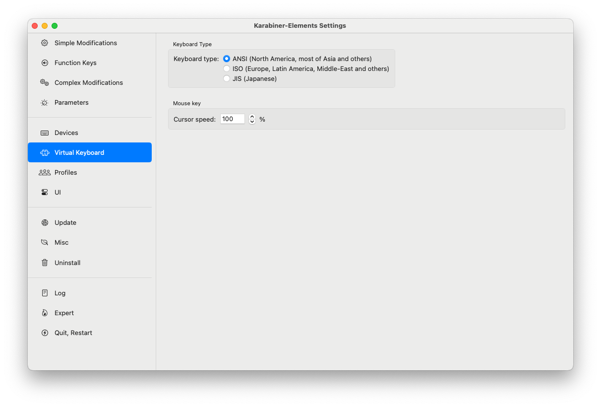 そしてこれを解消するためにはMacの設定で > キーボード > キーボードの種類を変更 からキーボードタイプをANSIに切り替えよという内容の記事がいくつかヒットするが、自分の環境でこれを行おうとするとその選択画面に辿り着く前に