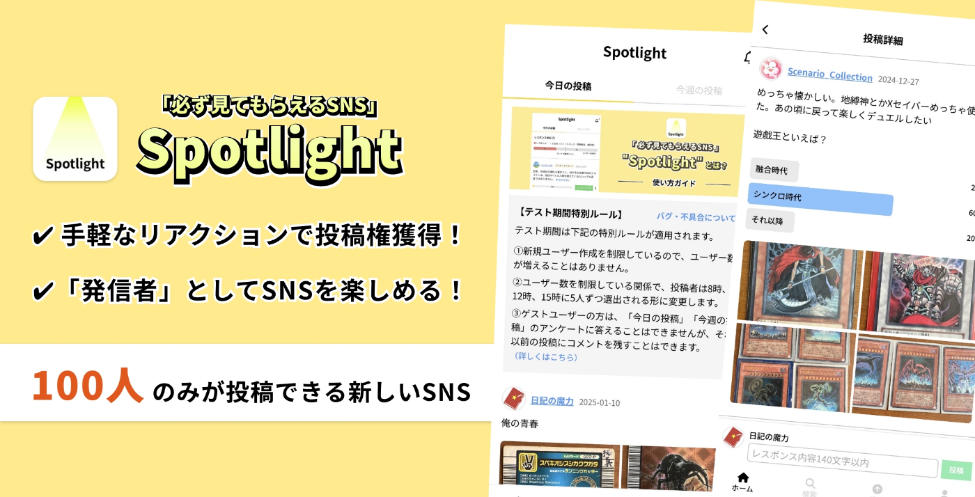 既存SNSだと、フォロワーが少ないユーザーは投稿をなかなか見てもらえませんが、Spotlightでは投稿数を制限することで、誰でも確実に注目される仕組みになっています。