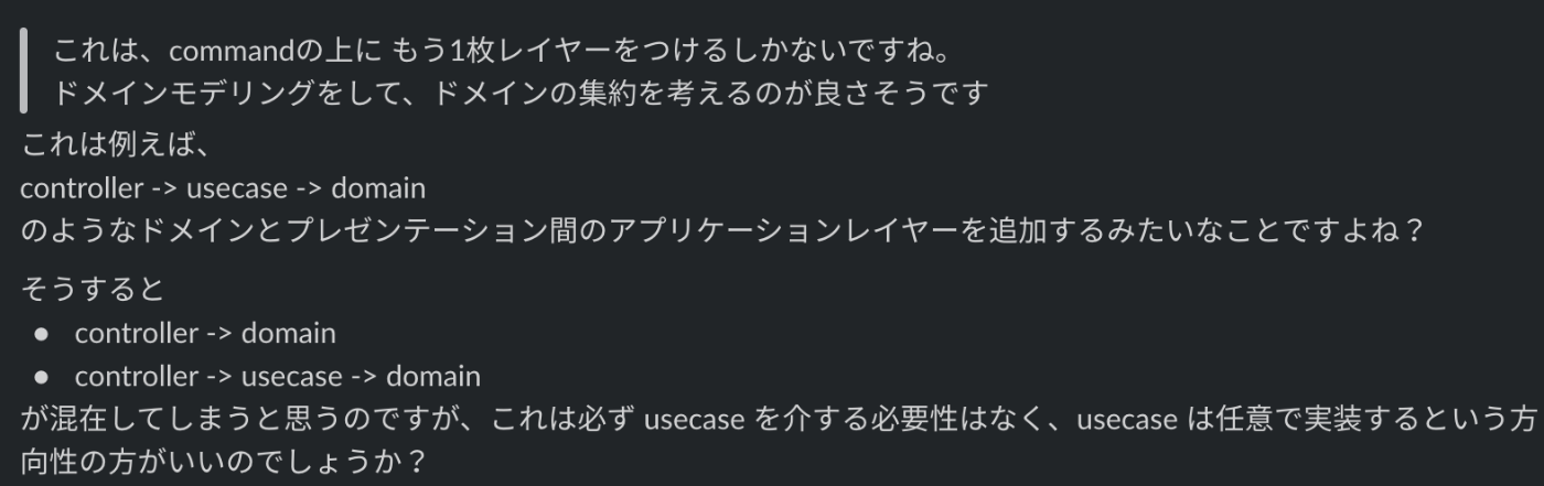 しかし、別に UseCase を挟んだところで、今 Controller -> Domains でうまくいっている箇所においてはただ domains を呼ぶだけの UseCase ができ、あまりにそういうのが増えて冗長なのでは…?