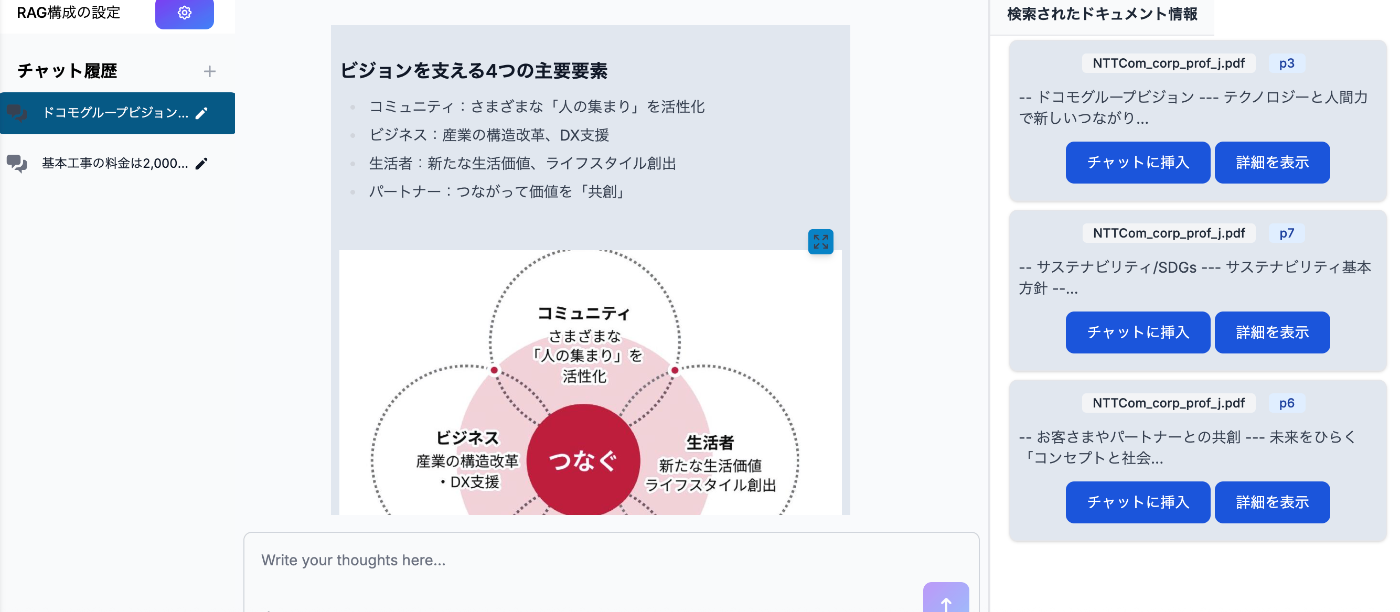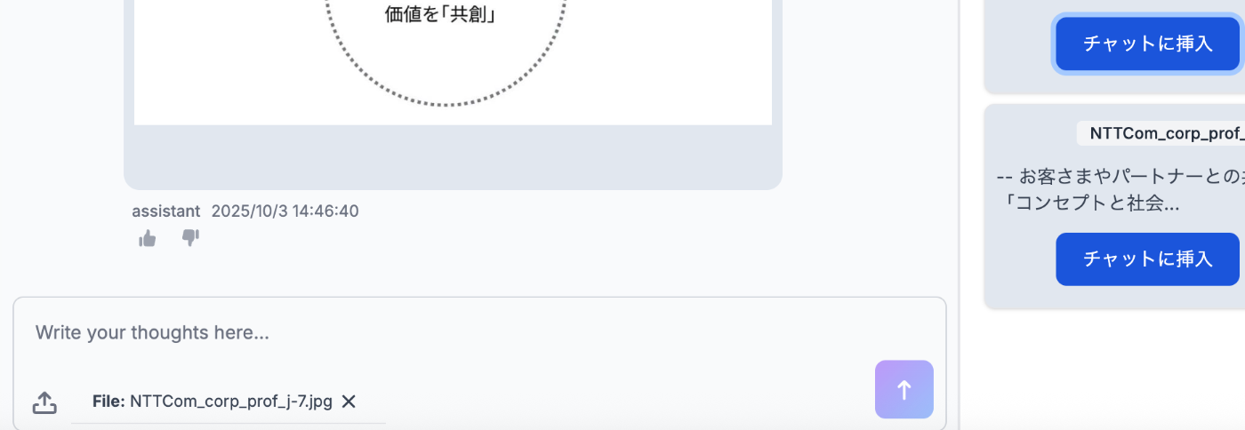 参照したドキュメントに対して、「チャットに挿入」ボタンを押すことで、チャットの質問に添付して、さらに詳細が聞くことができる機能が備わっていました。