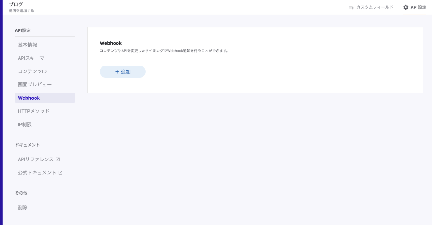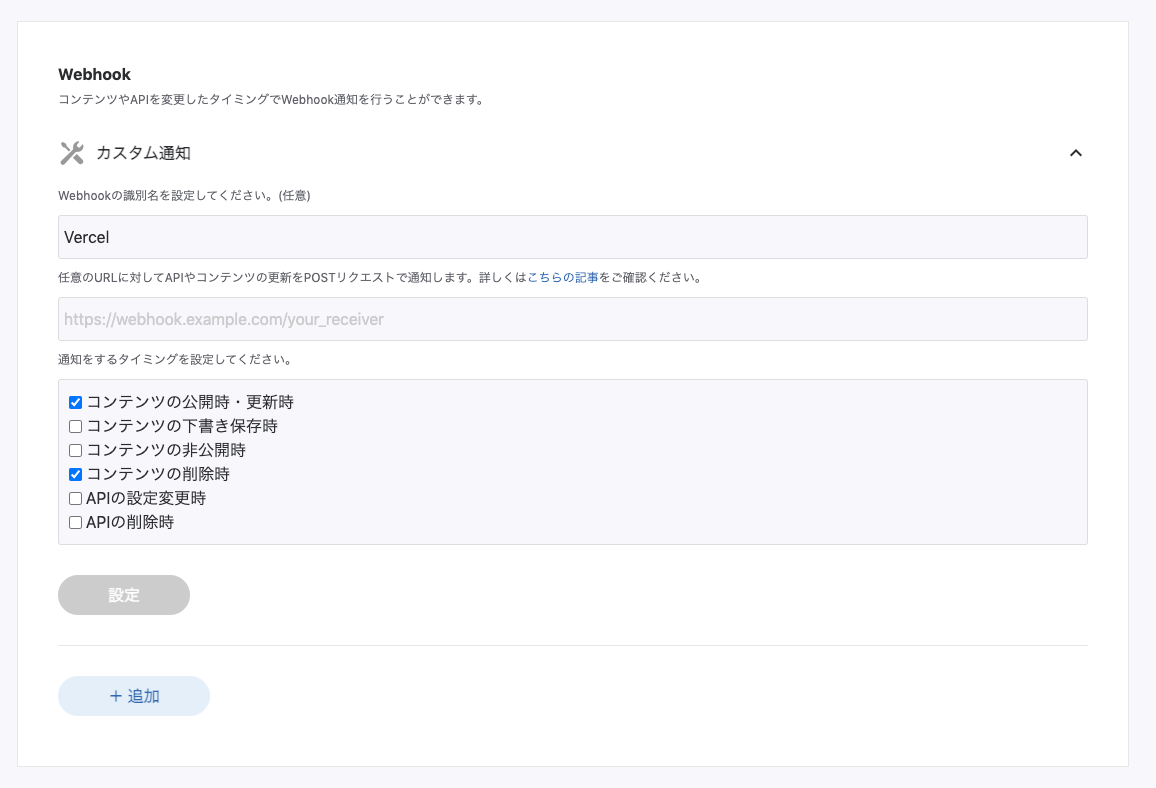Webhook の URL が発行されるので、microCMS 側の Webhook の設定を行う