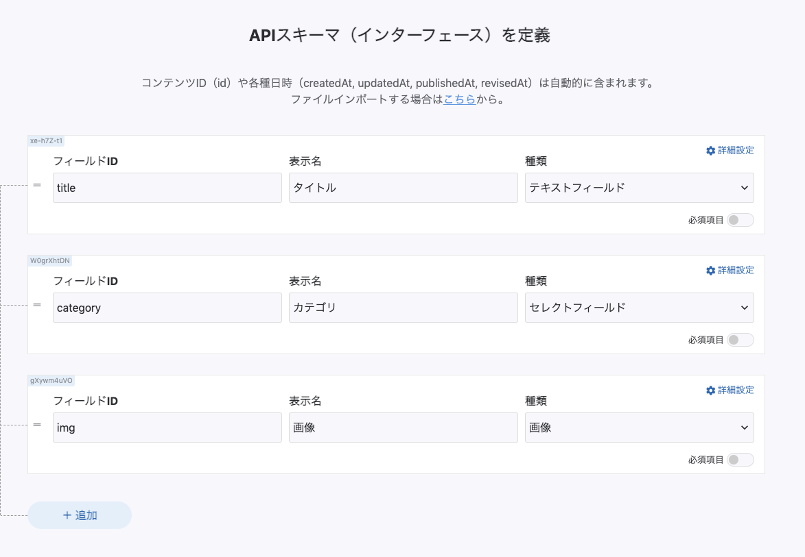 なおコンテンツ参照については単数の場合は[equals](例:category[equals]uN28Folyn)、複数の場合は[contains]のみが利用可能です。(例:tags[contains]oJIZmiban)