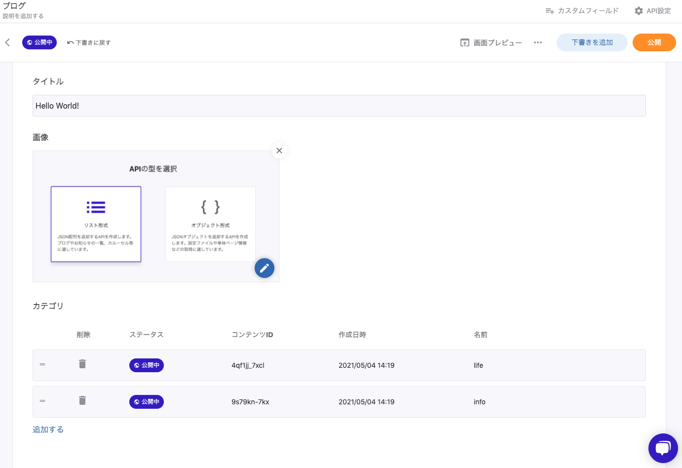 返却する API を作っていると思い、カテゴリを直接配列で指定していたが、コンテンツの参照をすることができる