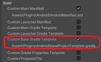 さらにProject Settings->Player Settings->Publish Settingsを開き Custom Base Gradle Template にチェックを入れます