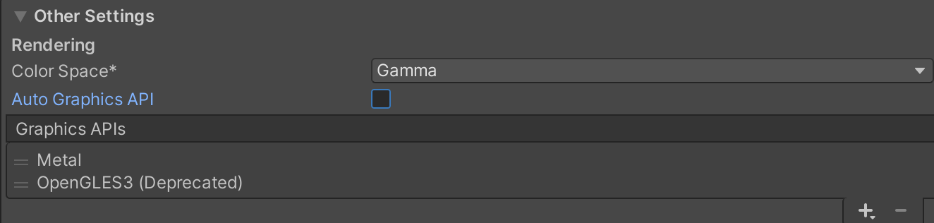 古いUnityの場合、Metalで実行ができないので、OpenGLES3