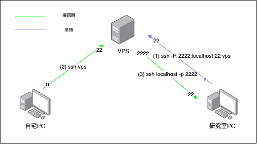 オプションはリモートポートフォワードを実現するためのオプション- 今回の図の場合はvpsの