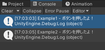 Debug.Log("Example2 - ボタンを押したよ!");