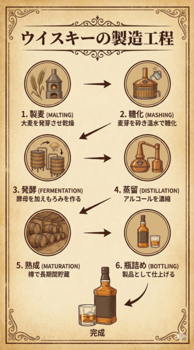 ウイスキーの製造工程を調べてポスター形式の説明イラストを生成して