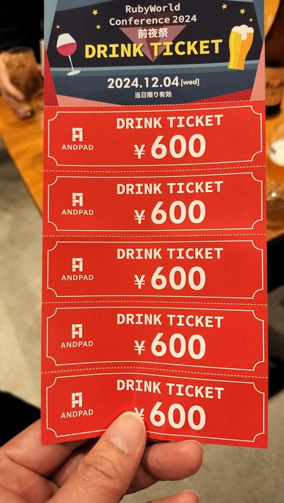 ドリンクチケットの裏に RubyWorld に参加してる ANDPAD 社員さん(?)のアイコンとメッセージが載ってたのは良かった。