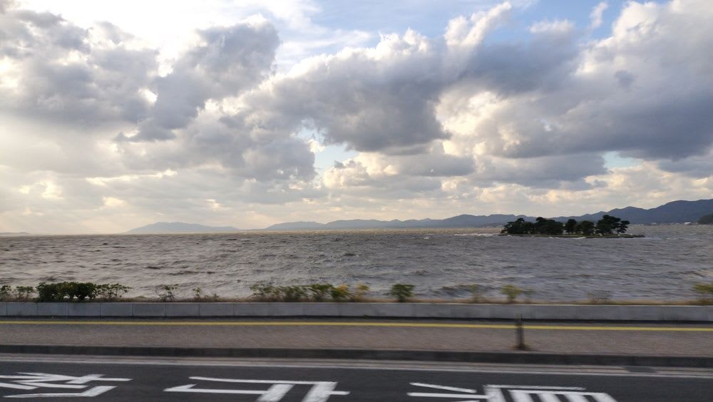 連絡バスで出雲空港に行く途中の宍道湖。