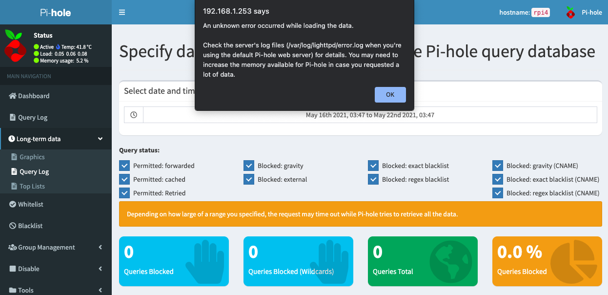 Pi-holeを数日稼働後、Query LogからLast 7 Daysを選択したところエラーメッセージが表示。クエリのログには何も表示されない。