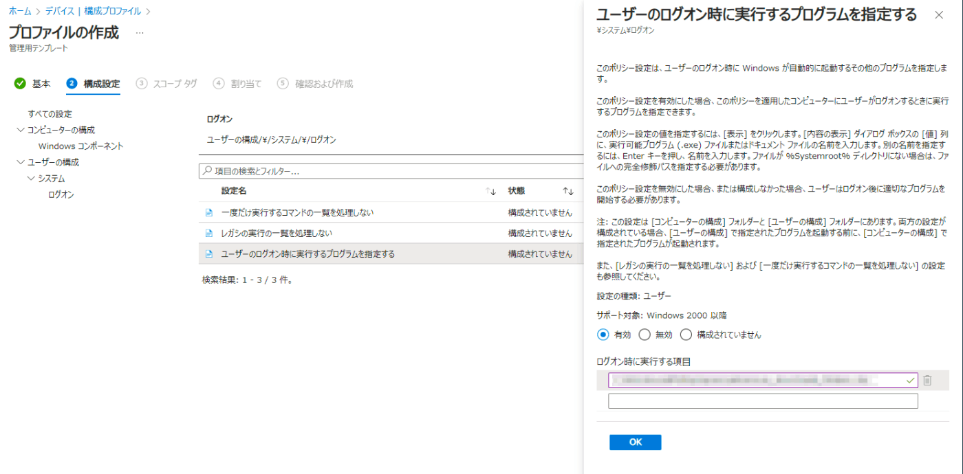 *場所:ユーザーの構成 > システム > ログオン > ユーザーのログオン時に実行するプログラムを指定する