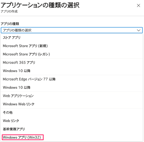 Intune 管理センターから アプリ > Windows > 追加 > Windowsアプリ(Win32)を選択する
