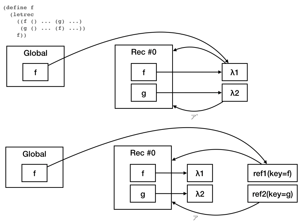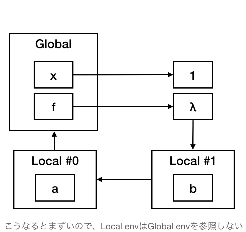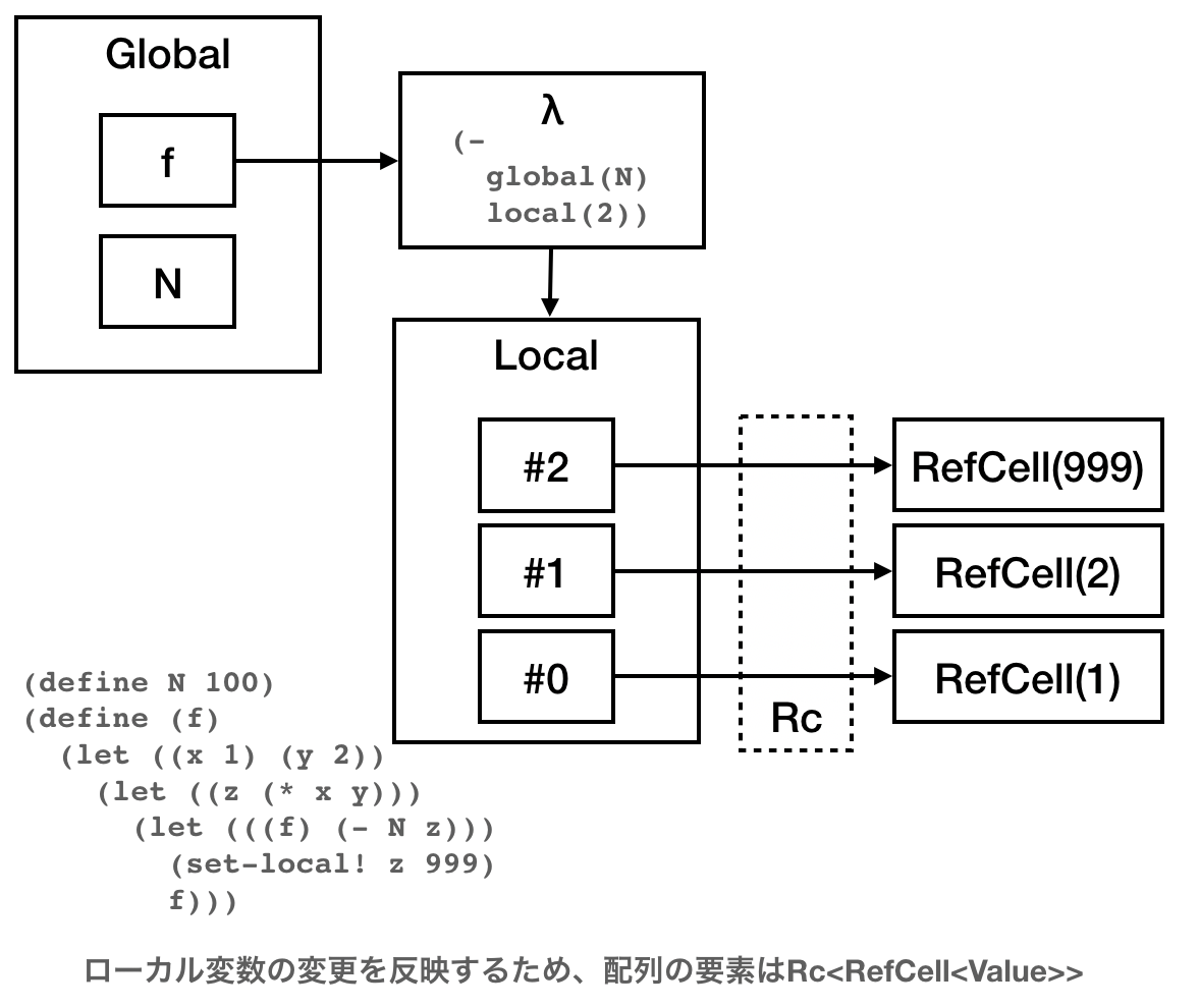 letrec実装の都合上、いちばんナイーブなやつ(parent: Option<Rc<LocalEnv>>を持つ)がいちばん扱いやすいのでそのようにした。環境のネストがそこまで深くなることはないし、これでも大差なかろう(小賢しい工夫をした実装は面倒なのでパフォーマンスの比較が困難ですが……)