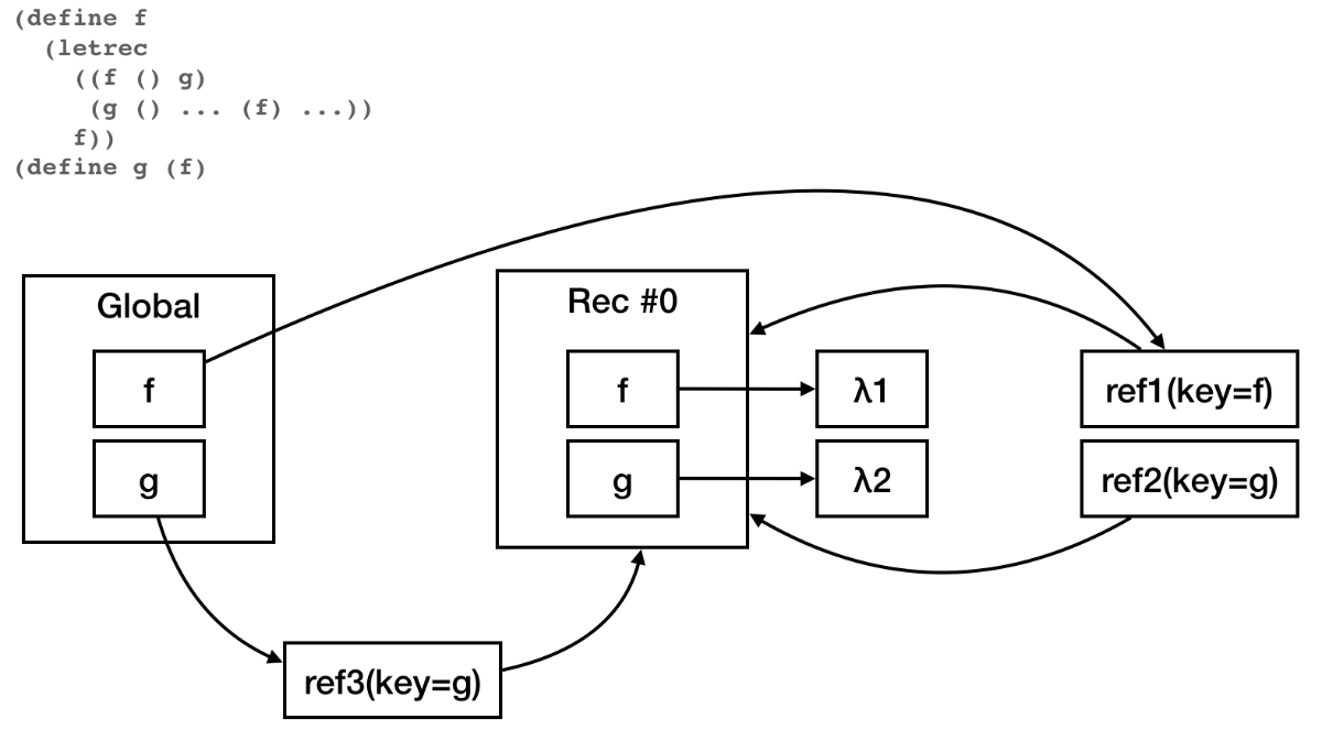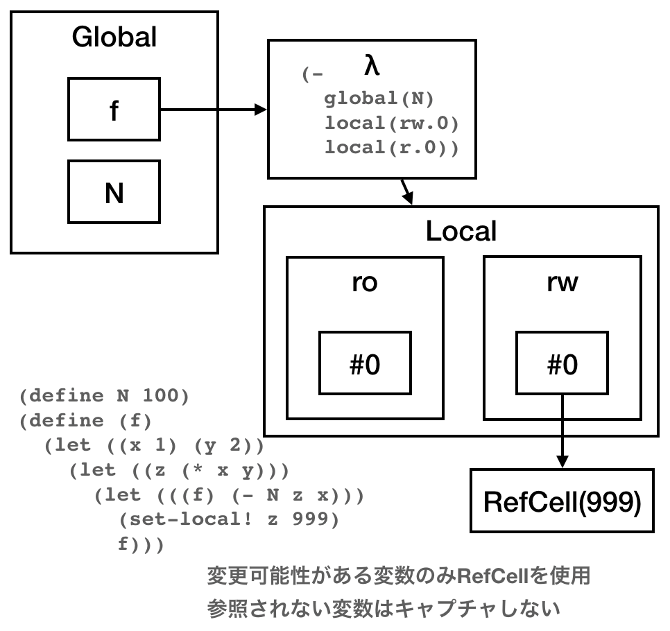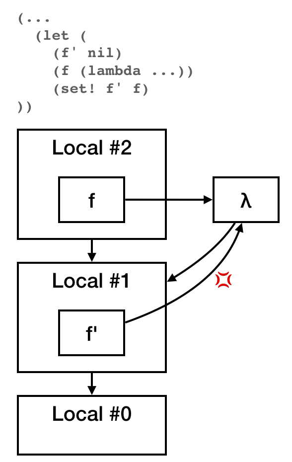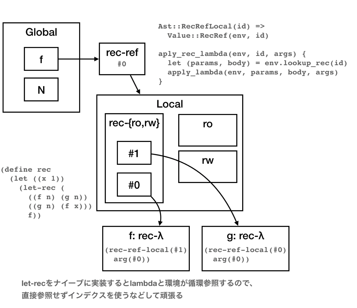 letrec実装の都合上、いちばんナイーブなやつ(parent: Option<Rc<LocalEnv>>を持つ)がいちばん扱いやすいのでそのようにした。環境のネストがそこまで深くなることはないし、これでも大差なかろう(小賢しい工夫をした実装は面倒なのでパフォーマンスの比較が困難ですが……)