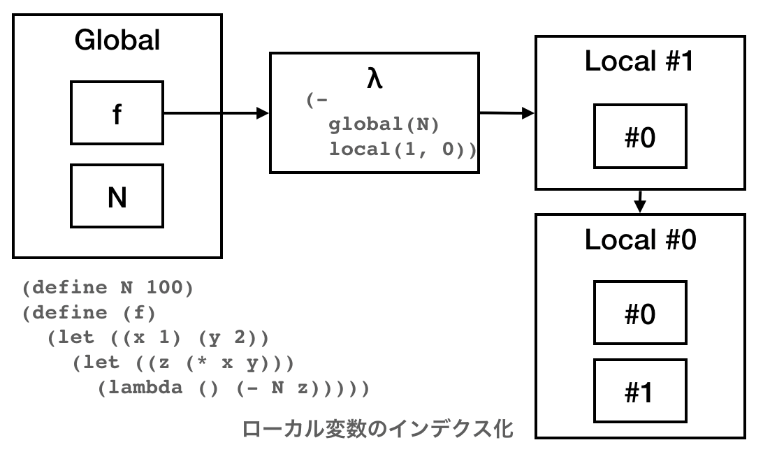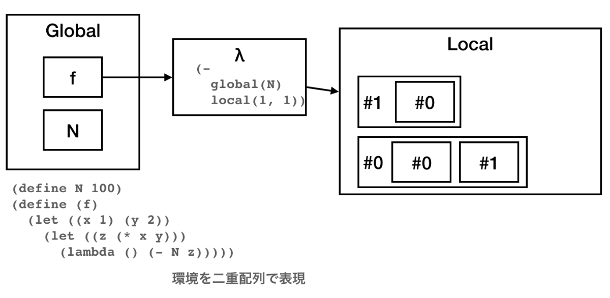 と、明示的に「現在の引数」を持ち回るようにした。lambdaが出現しなければ新しい環境を作る必要は無い。