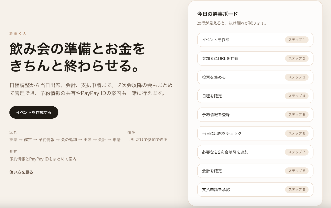 - 参加者はログイン不要: 共有されたURLを開くだけで、投票・出欠登録・支払申請が可能です。