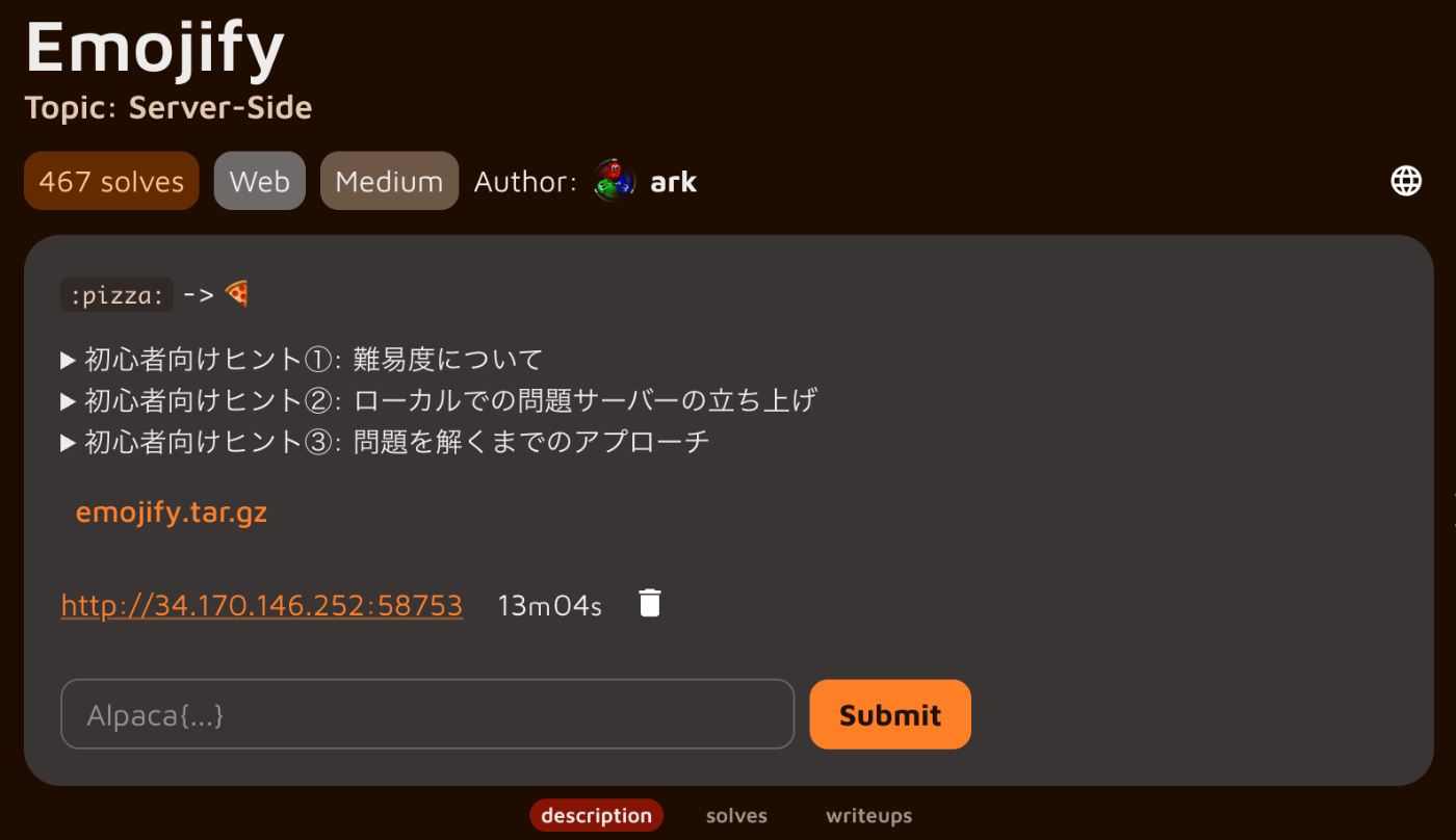 ただ、Alpacahack の共通ルールとして、攻撃した結果得られる機密情報を flag と呼び、その flag を入力することで正誤判定をする仕組み