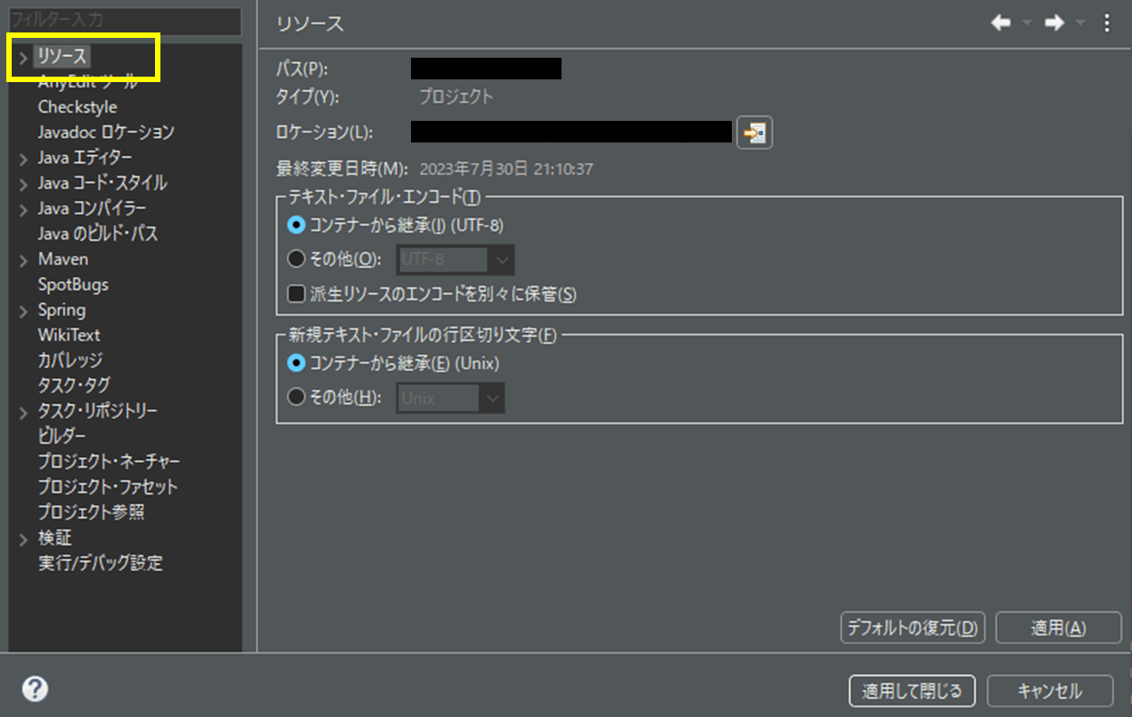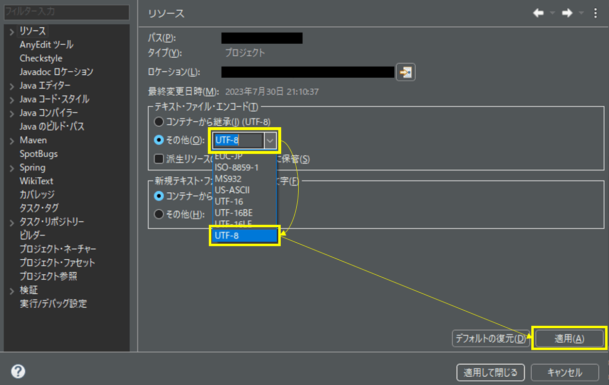 下の図のように、「テキスト・ファイル・エンコード」の設定を、「コンテナから継承」から「その他」に変更して、UTF-8 を指定して「適用」を押下すると直りました。
