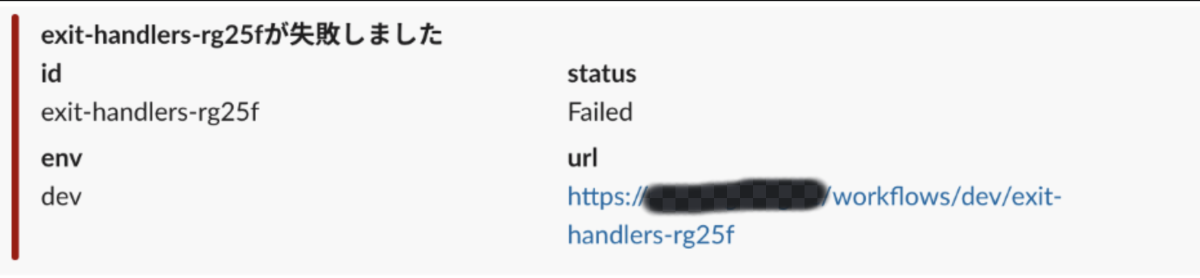 parametersのurlの部分に、UIのURLを入れることで失敗したWorkflowのURLを付け加えることができます。