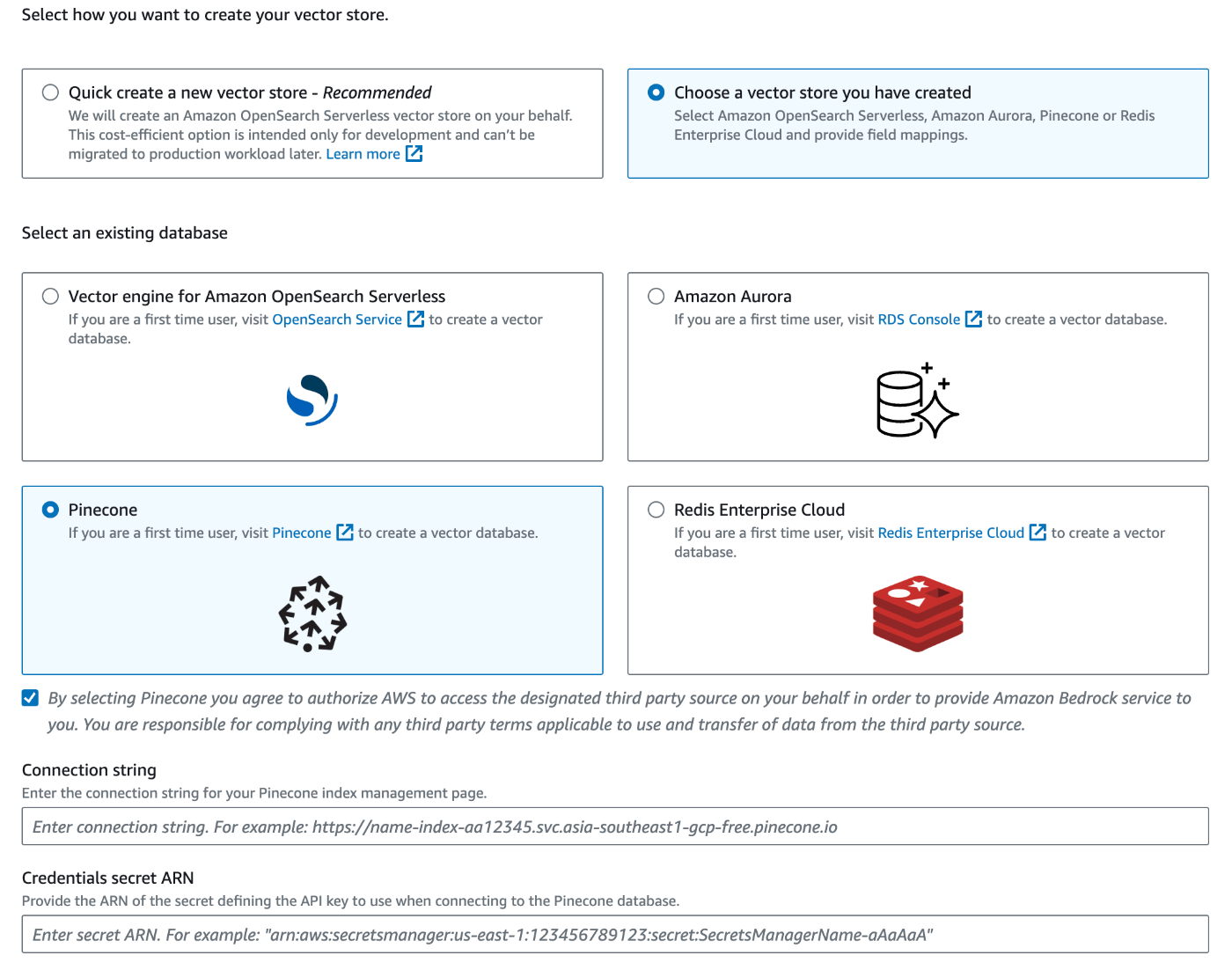 - Knowlegde Base Amazon BedrockでPineconeを使用するときに設定するsecret managerを作成している