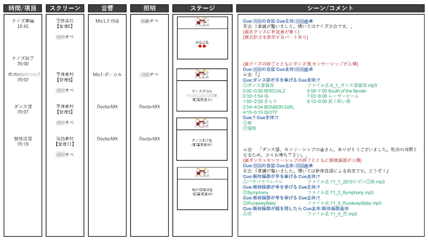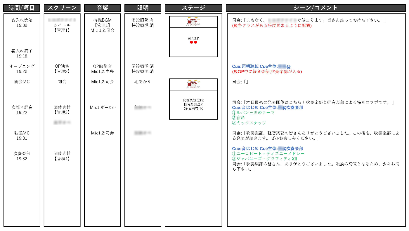 プランが具体化してきたら、設営、本番、撤収の3段階で構成される進行プランを作成します。各段階において、時間軸に沿って誰が何をするのかを詳細に記載します。進行プランで最も重要なのは、キュー(Cue)の管理です。以下の要素を必ず明記します。