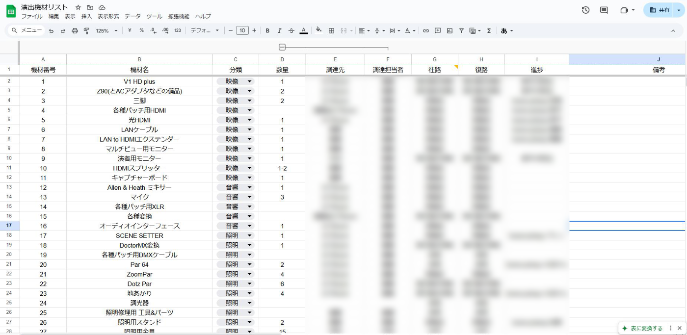 機材調達の状況は、スプレッドシートなどでの共有が効果的です。特に複数人で機材調達を行う場合、状況を逐次更新することで、余計な連絡を省きつつ機材状況を正確に把握できます。