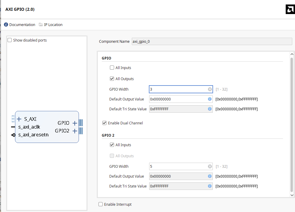 AXI_GPIOのチャンネル1をアダプタボードのLED制御出力、チャンネル2をアダプタボードのボタン入力に割り当てます。